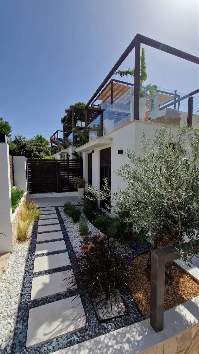 This entrance planter is inspired by the striking beauty of desert landscapes, featuring sculptural cacti, minimalist design, and natural stone elements that create a bold and welcoming focal point.