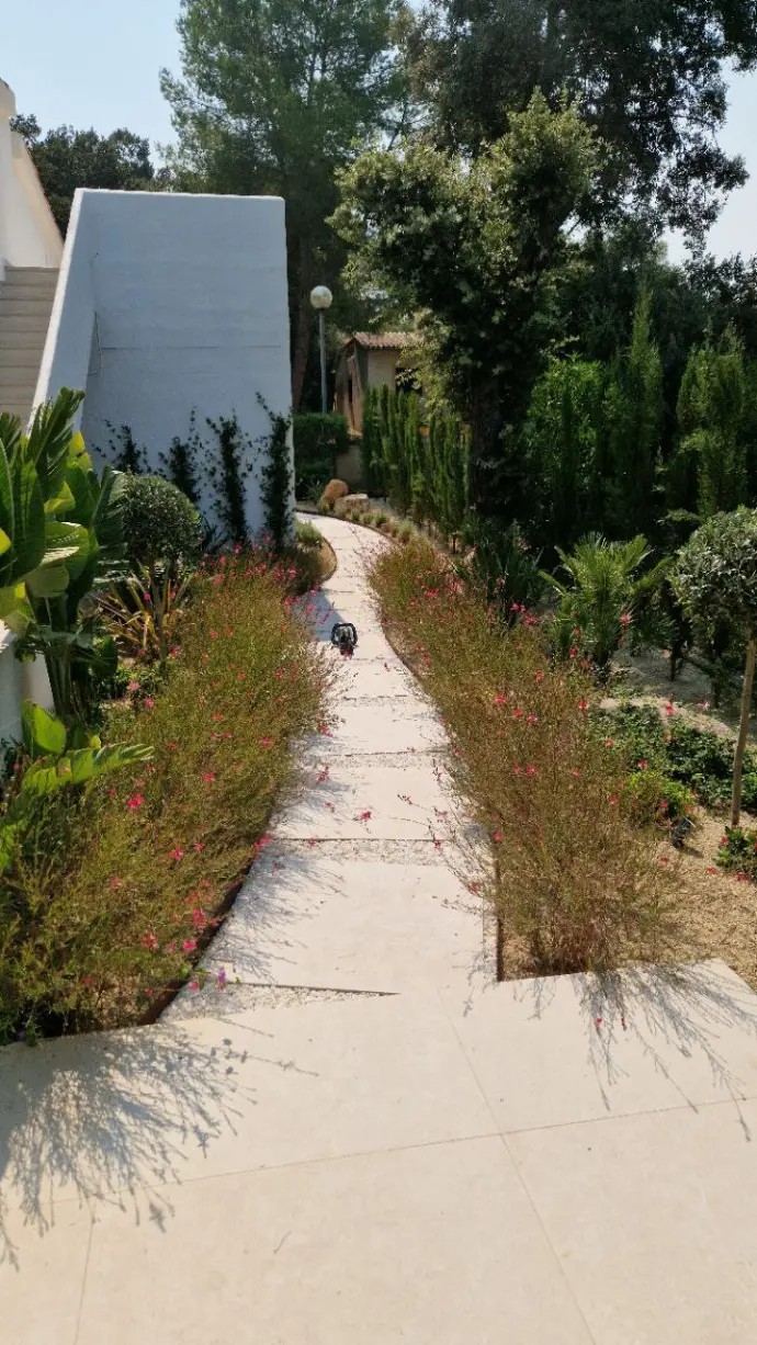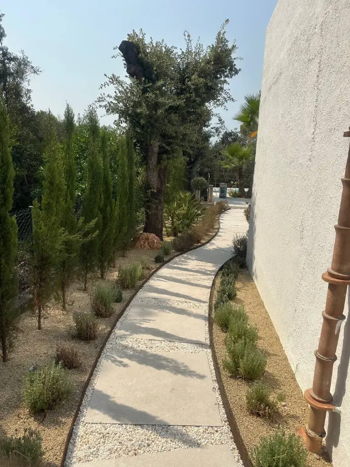This outdoor space was transformed into a clean, low-maintenance Mediterranean pathway featuring metal edging, mixed decorative gravel, and lush Mediterranean plants — creating a durable, elegant walkway perfect for year-round enjoyment